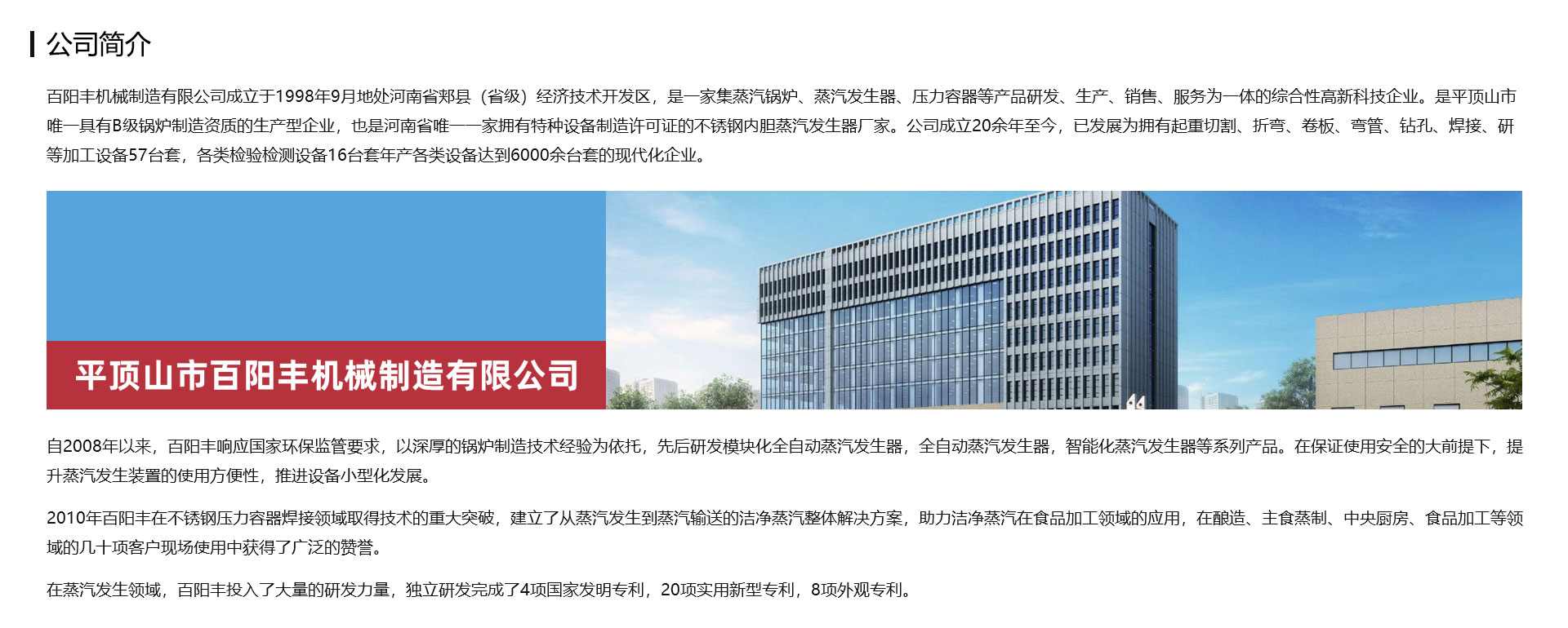 百陽豐機械制造有限公司成立于1998年9月地處河南省郟縣(省級)經濟技術開發(fā)區(qū),是一家集蒸汽鍋爐、蒸汽發(fā)生器、壓力容器等產品研發(fā)、生產、銷售、服務為一體的綜合性高新科技企業(yè)。是平頂山市一家具有B級鍋爐制造資質的生產型企業(yè),也是一家擁有特種設備制造許可證的不銹鋼內膽蒸汽發(fā)生器廠家。公司成立20余年至今,已發(fā)展為擁有起重切割、折彎、卷板、彎管、鉆孔、焊接、研等加工設備57臺套,各類檢驗檢測設備16臺套年產各類設備達到6000余臺套的現代化企業(yè)。